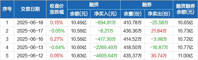 融资方面,当日融资买入935.35万元,融资偿还1630.16万元,融资净偿还694.81万元,连续5日净偿还累计7995.45万元。融券方面,融券卖出15.27万份,融券偿还40.85万份,融券余量410.78万份,融券余额1655.44万元。融资融券余额合计10.65亿元。