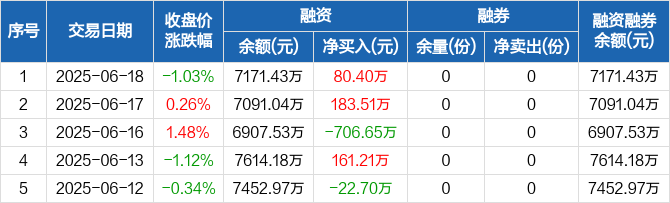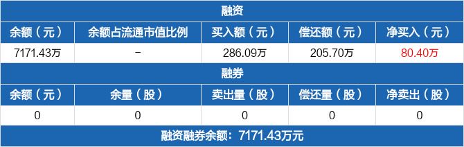 融资方面,当日融资买入286.09万元,融资偿还205.7万元,融资净买入80.4万元。融券方面,融券卖出0份,融券偿还0份,融券余量0份,融券余额0元。融资融券余额合计7171.43万元。