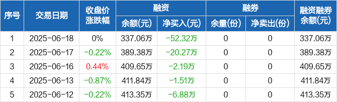 融资方面,当日融资买入32.42万元,融资偿还84.75万元,融资净偿还52.32万元,连续5日净偿还累计83.17万元。融券方面,融券卖出0份,融券偿还0份,融券余量0份,融券余额0元。融资融券余额合计337.06万元。