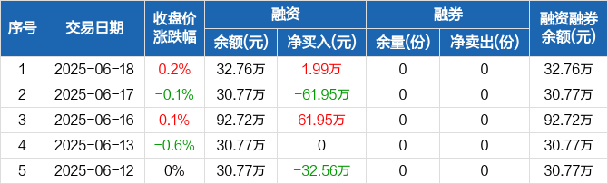 融资方面,当日融资买入1.99万元,融资偿还0元,融资净买入1.99万元。融券方面,融券卖出0份,融券偿还0份,融券余量0份,融券余额0元。融资融券余额合计32.76万元。
