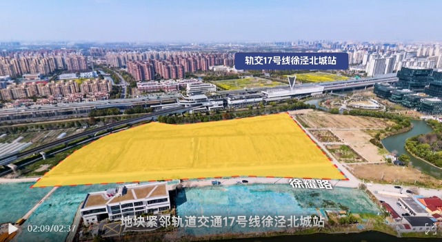 出让文件显示,该地块位于青浦区徐泾镇,紧邻轨道交通17号线徐泾北城站;规划为住宅用地,出让面积49446.43平方米,容积率2.3,计容面积113726.79平方米。