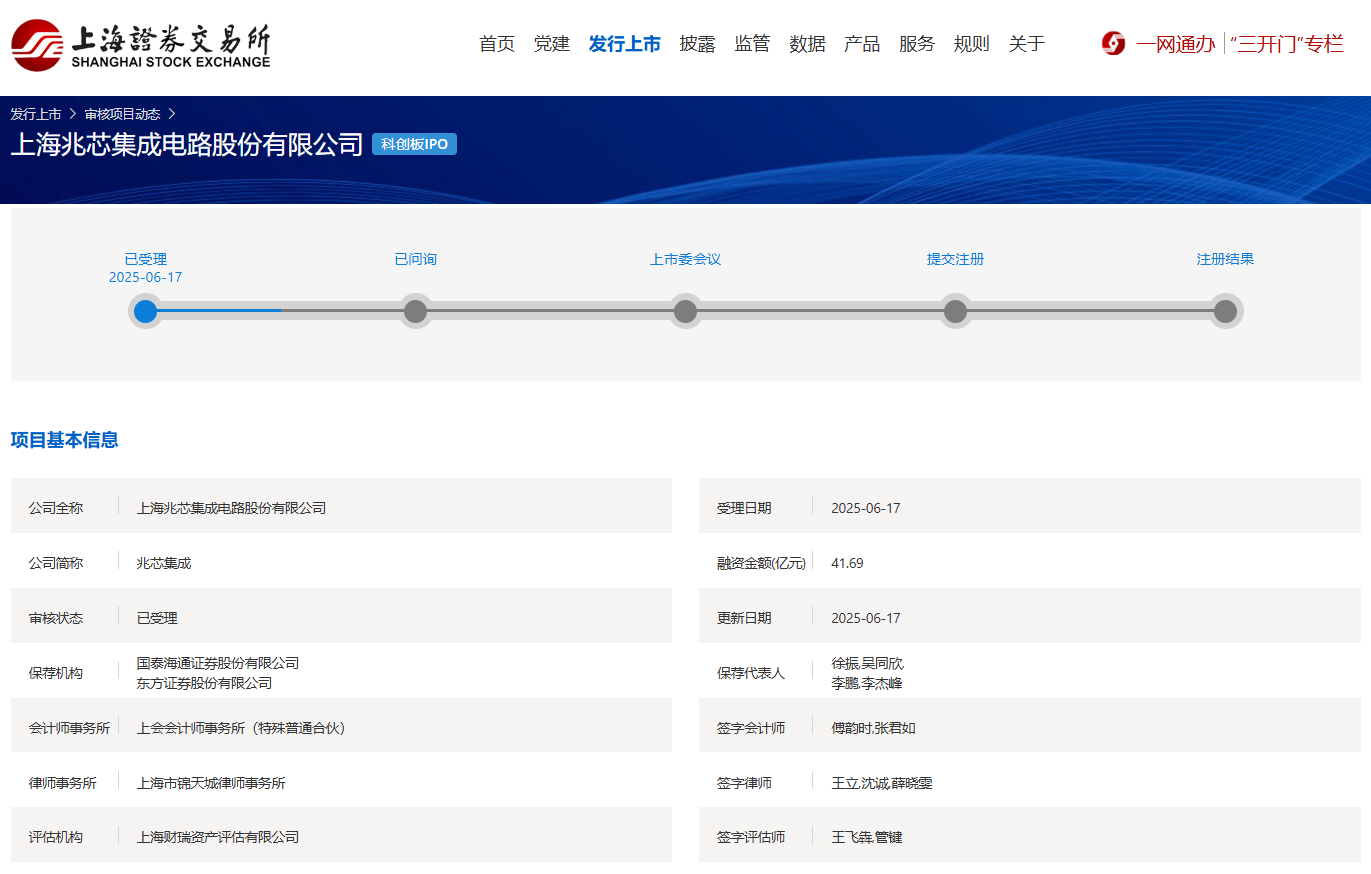 6月17日,上交所官网显示,上海兆芯集成电路股份有限公司(以下简称“兆芯集成”)科创板IPO获得受理,国泰海通证券及东方证券为其保荐机构。
