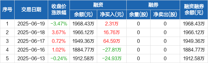 融资方面,当日融资买入168.21万元,融资偿还165.9万元,融资净买入2.31万元,连续3日净买入累计83.66万元。融券方面,融券卖出0股,融券偿还0股,融券余量0股,融券余额0元。融资融券余额合计1968.43万元。