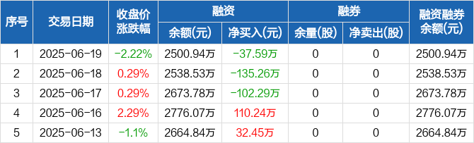 融资方面,当日融资买入76.79万元,融资偿还114.38万元,融资净偿还37.59万元,连续3日净偿还累计275.13万元。融券方面,融券卖出0股,融券偿还0股,融券余量0股,融券余额0元。融资融券余额合计2500.94万元。