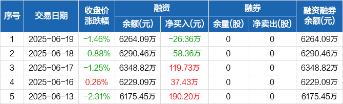 融资方面,当日融资买入190.71万元,融资偿还217.07万元,融资净偿还26.36万元。融券方面,融券卖出0股,融券偿还0股,融券余量0股,融券余额0元。融资融券余额合计6264.09万元。