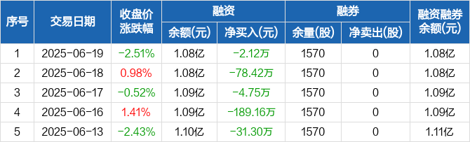 融资方面,当日融资买入175.86万元,融资偿还177.98万元,融资净偿还2.12万元,连续5日净偿还累计305.75万元。融券方面,融券卖出0股,融券偿还0股,融券余量1570股,融券余额4.76万元。融资融券余额合计1.08亿元。