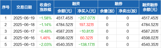 融资方面,当日融资买入194.35万元,融资偿还461.43万元,融资净偿还267.07万元。融券方面,融券卖出0股,融券偿还0股,融券余量0股,融券余额0元。融资融券余额合计4517.45万元。