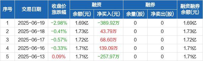 融资方面,当日融资买入502.66万元,融资偿还892.58万元,融资净偿还389.92万元。融券方面,融券卖出0股,融券偿还0股,融券余量0股,融券余额0元。融资融券余额合计1.69亿元。