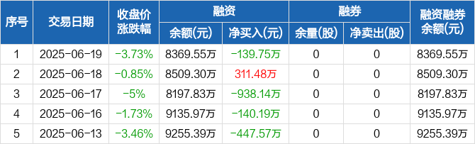 融资方面,当日融资买入89.5万元,融资偿还229.25万元,融资净偿还139.75万元。融券方面,融券卖出0股,融券偿还0股,融券余量0股,融券余额0元。融资融券余额合计8369.55万元。