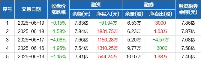 融资方面,当日融资买入2639.79万元,融资偿还2731.73万元,融资净偿还91.94万元。融券方面,融券卖出8900股,融券偿还5900股,融券余量6.53万股,融券余额268.99万元。融资融券余额合计7.86亿元。