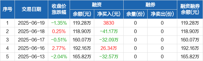 融资方面,当日融资买入22.9万元,融资偿还22.52万元,融资净买入3830元。融券方面,融券卖出0份,融券偿还0份,融券余量0份,融券余额0元。融资融券余额合计119.28万元。