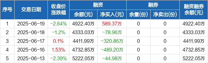 融资方面,当日融资买入1703.66万元,融资偿还1114.29万元,融资净买入589.37万元。融券方面,融券卖出0份,融券偿还0份,融券余量0份,融券余额0元。融资融券余额合计4922.4万元。