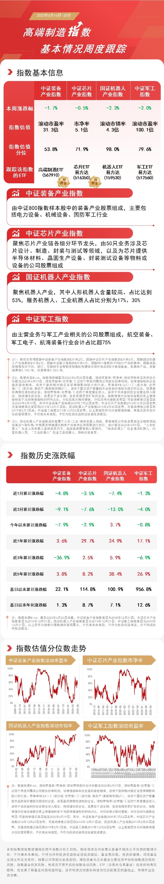 本周,中证芯片产业指数下跌0.5%,中证装备产业指数下跌1.7%,国证机器人产业指数下跌2.3%,中证军工指数下跌2.0%。