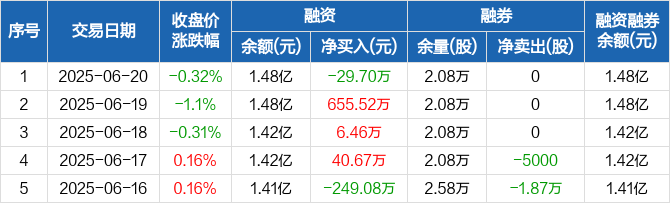 融资方面,当日融资买入394.48万元,融资偿还424.18万元,融资净偿还29.7万元。融券方面,融券卖出0股,融券偿还0股,融券余量2.08万股,融券余额13.06万元。融资融券余额合计1.48亿元。