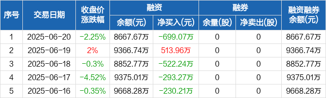 融资方面,当日融资买入780.81万元,融资偿还1479.88万元,融资净偿还699.07万元。融券方面,融券卖出0股,融券偿还0股,融券余量0股,融券余额0元。融资融券余额合计8667.67万元。