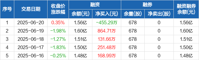 融资方面,当日融资买入513.7万元,融资偿还968.98万元,融资净偿还455.29万元。融券方面,融券卖出0股,融券偿还0股,融券余量678股,融券余额7763元。融资融券余额合计1.56亿元。