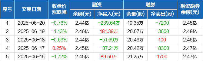 融资方面,当日融资买入989.65万元,融资偿还1229.28万元,融资净偿还239.64万元。融券方面,融券卖出0股,融券偿还7200股,融券余量19.35万股,融券余额150.93万元。融资融券余额合计2.45亿元。