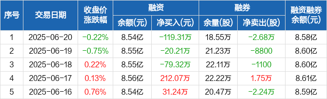 立昂微融资融券信息显示,2025年6月20日融资净偿还119.31万元;融资余额8.54亿元,较前一日下降0.14%。
