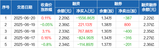 融资方面,当日融资买入1135.96万元,融资偿还2692.82万元,融资净偿还1556.86万元。融券方面,融券卖出300股,融券偿还687股,融券余量1.34万股,融券余额147.2万元。融资融券余额合计2.22亿元。