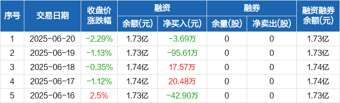融资方面,当日融资买入303.91万元,融资偿还307.6万元,融资净偿还3.69万元。融券方面,融券卖出0股,融券偿还0股,融券余量0股,融券余额0元。融资融券余额合计1.73亿元。