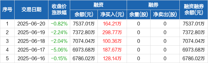 融资方面,当日融资买入398.06万元,融资偿还233.85万元,融资净买入164.21万元,连续5日净买入累计879.13万元。融券方面,融券卖出0股,融券偿还0股,融券余量0股,融券余额0元。融资融券余额合计7537.01万元。