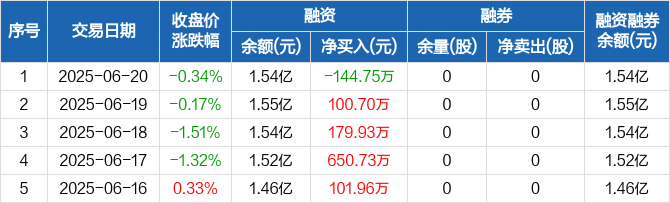 融资方面,当日融资买入300.41万元,融资偿还445.16万元,融资净偿还144.75万元。融券方面,融券卖出0股,融券偿还0股,融券余量0股,融券余额0元。融资融券余额合计1.54亿元。