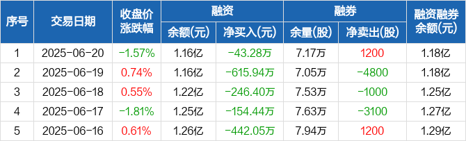融资方面,当日融资买入329.95万元,融资偿还373.23万元,融资净偿还43.28万元,连续5日净偿还累计1502.12万元。融券方面,融券卖出2000股,融券偿还800股,融券余量7.17万股,融券余额220.76万元。融资融券余额合计1.18亿元。