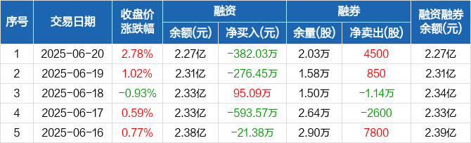 融资方面,当日融资买入1451.66万元,融资偿还1833.69万元,融资净偿还382.03万元。融券方面,融券卖出4700股,融券偿还200股,融券余量2.03万股,融券余额24.81万元。融资融券余额合计2.27亿元。
