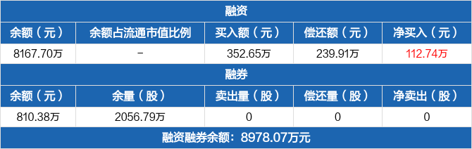 融资方面,当日融资买入352.65万元,融资偿还239.91万元,融资净买入112.74万元,连续7日净买入累计1209.85万元。融券方面,融券卖出0份,融券偿还0份,融券余量2056.79万份,融券余额810.38万元。融资融券余额合计8978.07万元。