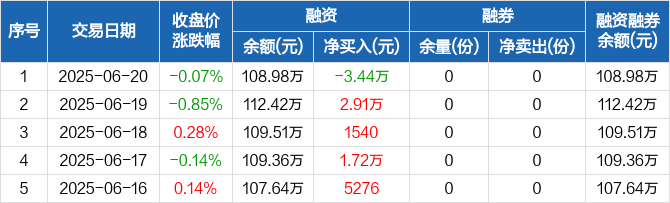 融资方面,当日融资买入0元,融资偿还3.44万元,融资净偿还3.44万元。融券方面,融券卖出0份,融券偿还0份,融券余量0份,融券余额0元。融资融券余额合计108.98万元。