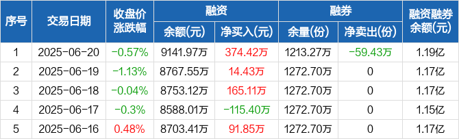 融资方面,当日融资买入1019.59万元,融资偿还645.17万元,融资净买入374.42万元,连续3日净买入累计553.96万元。融券方面,融券卖出0份,融券偿还59.43万份,融券余量1213.27万份,融券余额2756.55万元。融资融券余额合计1.19亿元。