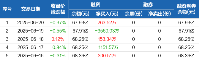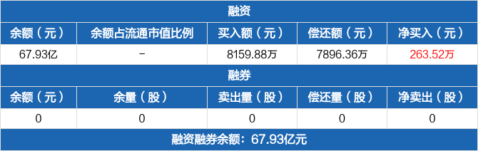 融资方面,当日融资买入8159.88万元,融资偿还7896.36万元,融资净买入263.52万元。融券方面,融券卖出0份,融券偿还0份,融券余量0份,融券余额0元。融资融券余额合计67.93亿元。