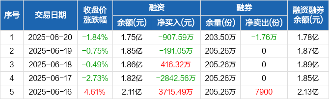 融资方面,当日融资买入2229.42万元,融资偿还3137.02万元,融资净偿还907.59万元。融券方面,融券卖出0份,融券偿还1.76万份,融券余量203.5万份,融券余额239.32万元。融资融券余额合计1.78亿元。