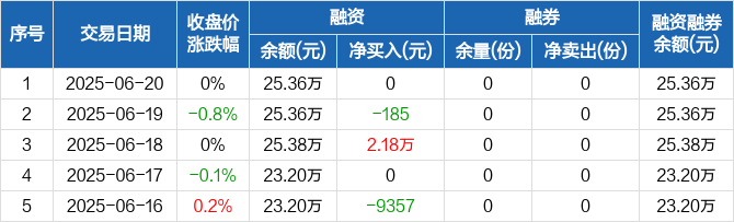 融资方面,当日融资买入0元,融资偿还0元,融资净买入0元。融券方面,融券卖出0份,融券偿还0份,融券余量0份,融券余额0元。融资融券余额合计25.36万元。