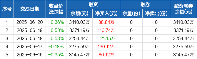 融资方面,当日融资买入150.2万元,融资偿还111.36万元,融资净买入38.84万元。融券方面,融券卖出0份,融券偿还0份,融券余量0份,融券余额0元。融资融券余额合计3410.03万元。