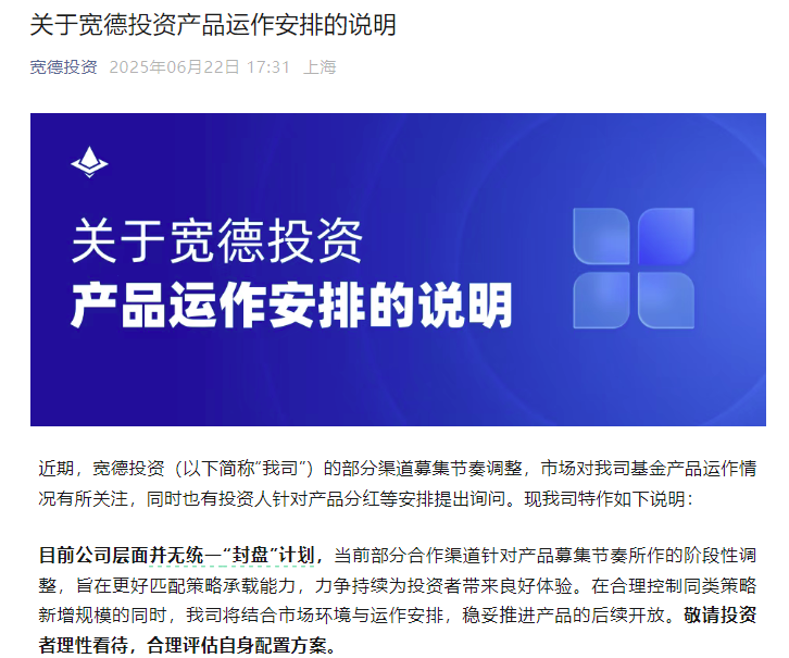 宽德私募近日发布公告称,当前部分合作渠道针对产品募集节奏所作的阶段性调整,旨在更好匹配策略承载能力,力争持续为投资者带来良好体验。在合理控制同类策略新增规模的同时,公司将结合市场环境与运作安排,稳妥推进产品的后续开放。