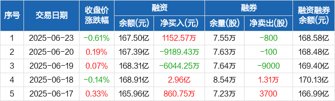 融资方面,当日融资买入2.86亿元,融资偿还2.74亿元,融资净买入1152.57万元。融券方面,融券卖出3600股,融券偿还4400股,融券余量7.55万股,融券余额1.07亿元。融资融券余额合计168.58亿元。