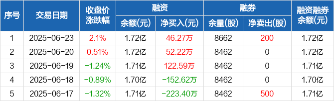 融资方面,当日融资买入701.72万元,融资偿还655.44万元,融资净买入46.27万元,连续3日净买入累计221.08万元。融券方面,融券卖出200股,融券偿还0股,融券余量8662股,融券余额15.59万元。融资融券余额合计1.72亿元。