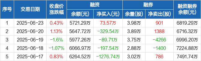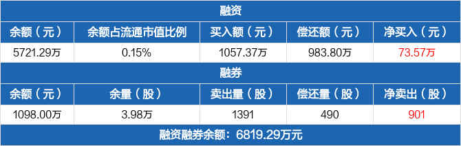 融资方面,当日融资买入1057.37万元,融资偿还983.8万元,融资净买入73.57万元。融券方面,融券卖出1391股,融券偿还490股,融券余量3.98万股,融券余额1098万元。融资融券余额合计6819.29万元。