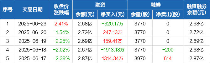 融资方面,当日融资买入1196.41万元,融资偿还1516.58万元,融资净偿还320.17万元。融券方面,融券卖出0股,融券偿还0股,融券余量3770股,融券余额5.94万元。融资融券余额合计2.68亿元。