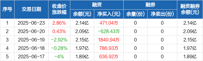 融资方面,当日融资买入1.14亿元,融资偿还1.09亿元,融资净买入471.04万元。融券方面,融券卖出0份,融券偿还0份,融券余量0份,融券余额0元。融资融券余额合计2.14亿元。
