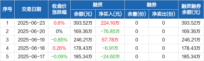融资方面,当日融资买入254.78万元,融资偿还30.61万元,融资净买入224.16万元。融券方面,融券卖出0份,融券偿还0份,融券余量0份,融券余额0元。融资融券余额合计393.52万元。