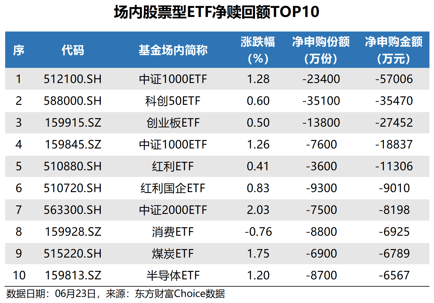 数据还显示,昨日净赎回金额最多的场内股票型ETF为中证1000ETF,净赎回金额5.7亿元;科创50ETF紧随其后,净赎回金额3.55亿元。