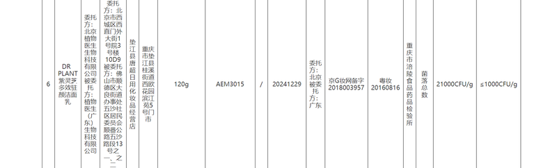 而在2022年,植物医生却因产品质量“翻了车”。据重庆市药品监督管理局发布的“关于7批次不符合规定化妆品的通告”,在2022年重庆市化妆品监督抽检工作中,经重庆市永川食品药品检验所等单位检验,共有7批次化妆品不符合规定。其中,由北京植物医生生物科技有限公司委托植物医生(广东)生物科技有限公司生产的1批次DRPLANT紫灵芝多效驻颜洁面乳被检出菌落总数项目不合格,规定要求为≤1000CFU/g,该批次产品菌落总数检验结果为21000CFU/g,超标21倍。