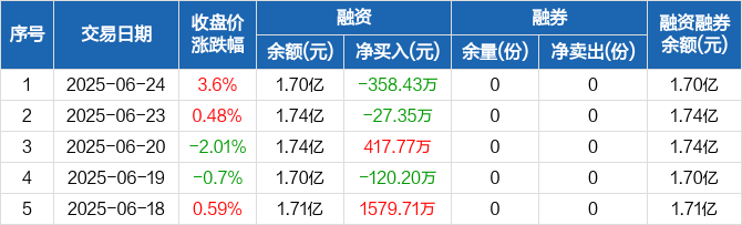 融资方面,当日融资买入3217.28万元,融资偿还3575.71万元,融资净偿还358.43万元。融券方面,融券卖出0份,融券偿还0份,融券余量0份,融券余额0元。融资融券余额合计1.7亿元。