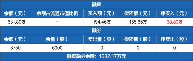 融资方面,当日融资买入194.46万元,融资偿还155.65万元,融资净买入38.8万元。融券方面,融券卖出0份,融券偿还0份,融券余量6000份,融券余额3750元。融资融券余额合计1632.17万元。