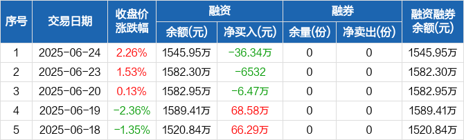 融资方面,当日融资买入213.82万元,融资偿还250.17万元,融资净偿还36.34万元,连续3日净偿还累计43.46万元。融券方面,融券卖出0份,融券偿还0份,融券余量0份,融券余额0元。融资融券余额合计1545.95万元。