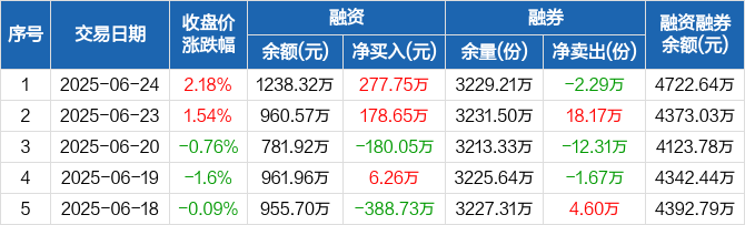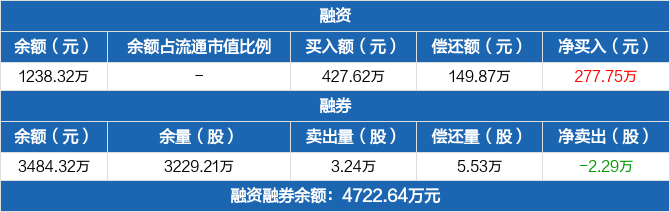 融资方面,当日融资买入427.62万元,融资偿还149.87万元,融资净买入277.75万元。融券方面,融券卖出3.24万份,融券偿还5.53万份,融券余量3229.21万份,融券余额3484.32万元。融资融券余额合计4722.64万元。