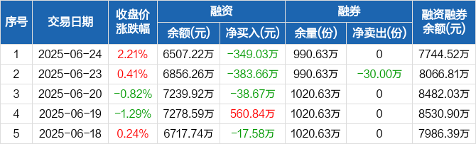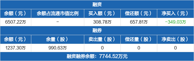 融资方面,当日融资买入308.78万元,融资偿还657.81万元,融资净偿还349.03万元,连续3日净偿还累计771.36万元。融券方面,融券卖出0份,融券偿还0份,融券余量990.63万份,融券余额1237.3万元。融资融券余额合计7744.52万元。