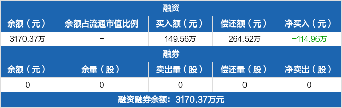 融资方面,当日融资买入149.56万元,融资偿还264.52万元,融资净偿还114.96万元。融券方面,融券卖出0份,融券偿还0份,融券余量0份,融券余额0元。融资融券余额合计3170.37万元。